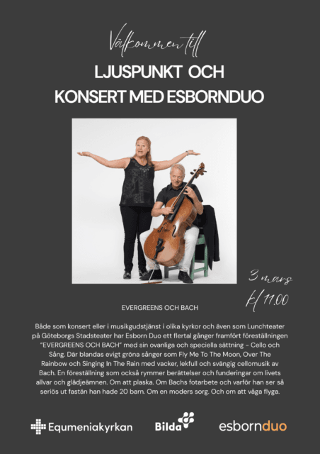 Detta evenemang har redan ägt rum. 3 mar 11:00 - 13:00 Ljuspunkten- ESBORN DUO – Evergreens och Bach Lennart Esborn – cello, Monica Esborn – sång Lägg till i kalender Google Kalender iCalendar Outlook 365 Outlook Live Dela